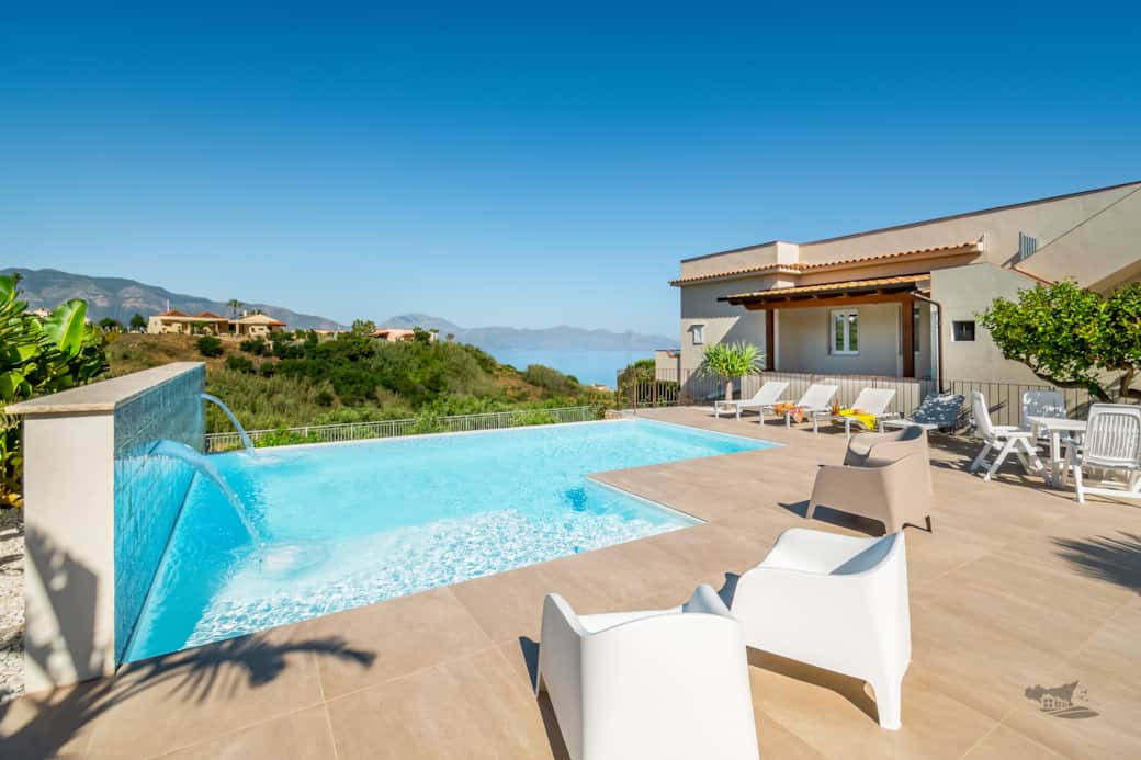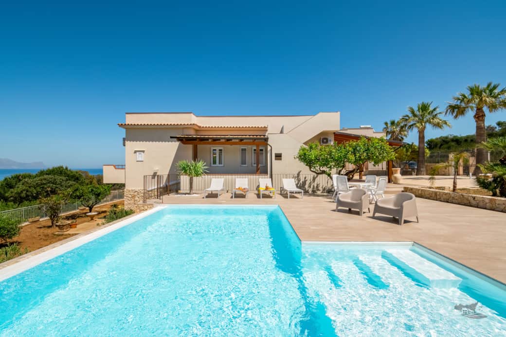 Villa DellAcqua is a splendid villa with pool near the beach, where the sea and tranquility meet. Outside, you are welcomed by a magnificent 4×8 m private infinity swimming pool overlooking the Gulf of Castellammare — the perfect spot to admire enchanting sunsets — framed by an olive garden.
